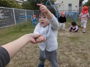 草を触ったり車を指さして声を出したりと