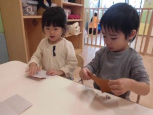 茶色の折り紙をもらい、保育者と一緒に