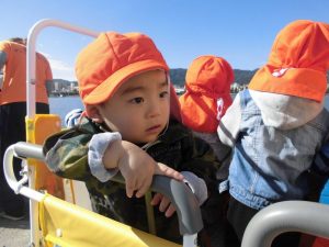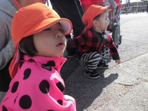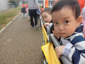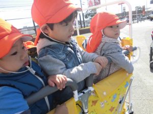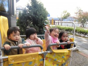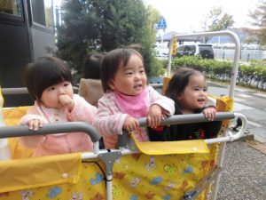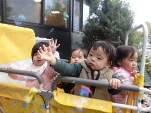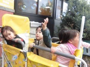 もも組さんは園の前で散歩車に乗り