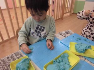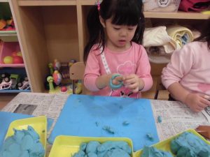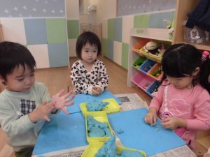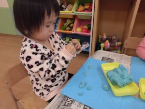 粘土遊びでは、「これはどんぐり!」「見て!指輪作った!」
