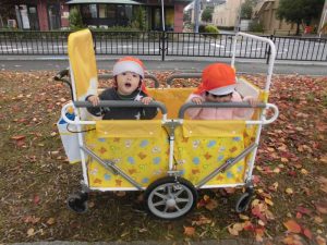 立ち乗りのお散歩車に乗っていきました!