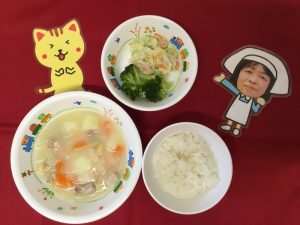 本日のお給食です♪ ★ご飯 ★大豆のシチュー ★ツナサラダ ★ブロッコリーの甘酢和え