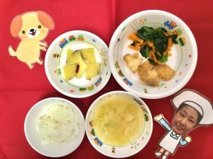 本日のお給食です♪ ★ご飯 ★味噌汁 ★魚の唐揚げ ★おかか和え