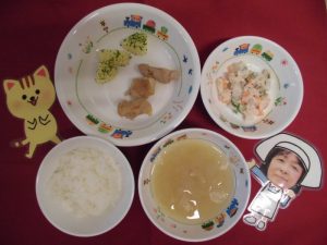 本日のお給食です♪ ★ご飯 ★味噌汁 ★照り焼きチキン ★大根サラダ ★粉ふき芋