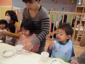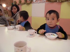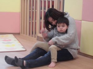 いつもと違う雰囲気の保育園に戸惑う様子が