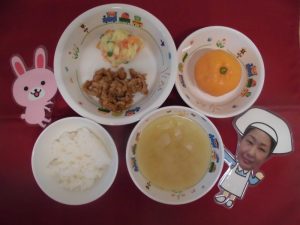 本日のお給食です♪ ★ご飯 ★味噌汁 ★照り焼きチキン ★スパゲティソテー野菜 ★さつ...