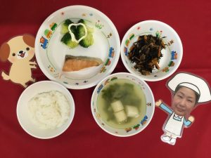 本日の給食です♪ ★ご飯 ★味噌汁 ★鮭の塩焼き ★ひじきの炒り煮 ★ゆでブロッコリー