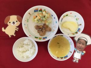本日の給食です♪ ★ご飯 ★コーンスープ ★ローストチキン ★ポテトサラダ ★りんご