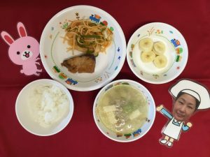 本日の給食です♪ ★ご飯 ★豚汁 ★照り焼き魚 ★スパゲティソテー ★バナナ