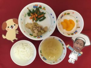 本日の給食です♪ ★ご飯 ★味噌汁 ★チキンソテー ★含め煮 ★みかん缶