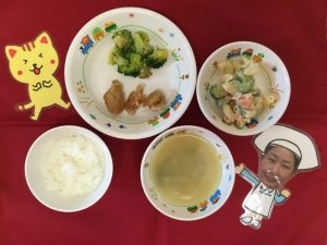 本日の給食です♪ ★ご飯 ★味噌汁 ★鶏のから揚げ ★おか...