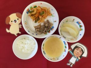 本日の給食です♪ ★ご飯 ★味噌汁 ★豚肉のみそ焼き ★マカロニソテー ...