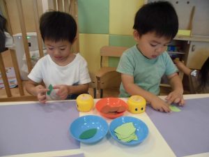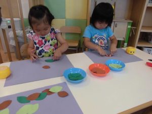 2歳児クラスは葉っぱ型の画用紙をのりで