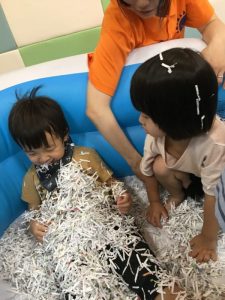 ビニールプールに紙吹雪をたくさん入れ、