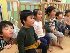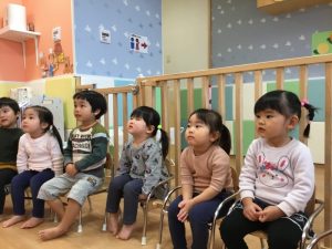 まずはみんなでお椅子に座り保育士のお話を聞きま!