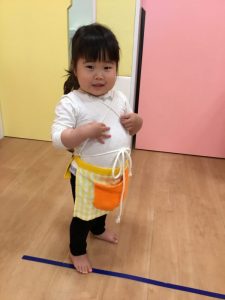 エプロンを身につけ、ポポちゃんをおんぶする