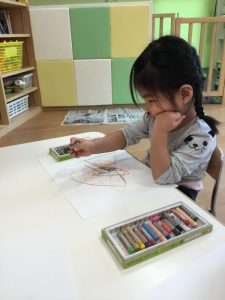りんご組?さんは、何やらクレヨン、絵の具を使った