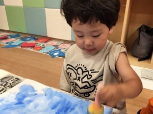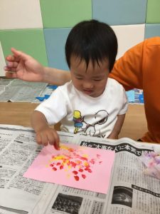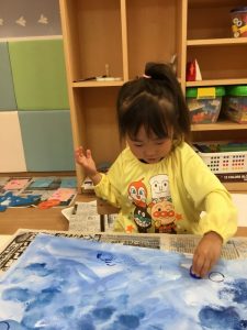 指スタンプの絵の具の感触が不思議で
