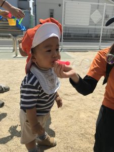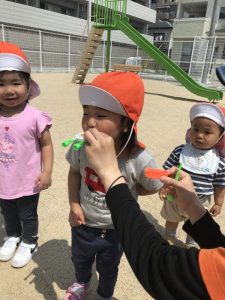 保育者の「ふ〜」という声かけに