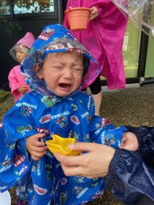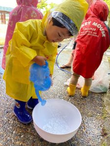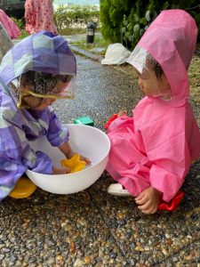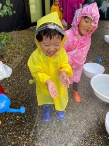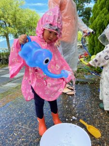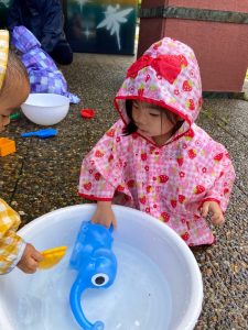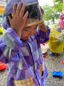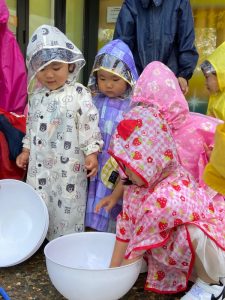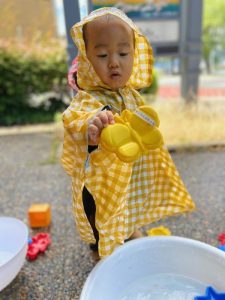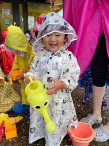 園前のスペースでレインコートを着て