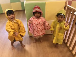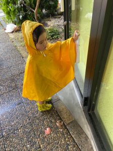 お家で用意してもらったレインコートを着て