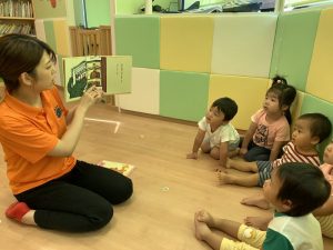 絵本を中心に扇状に座らせ、前の子2人の間から
