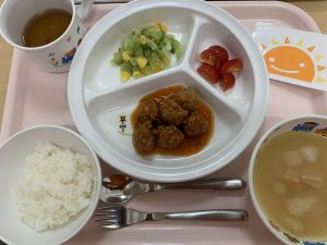 ご飯 味噌汁  ミートボール コールスローサラダ ミニトマト