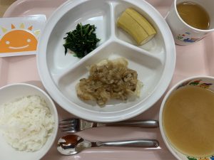 粥 味噌汁 豆腐と野菜のくず煮 ほうれん草のお浸し バナナ
