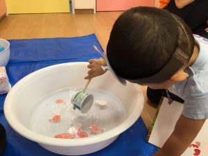 保育者お手製の〝ポイ〟を使って金魚をすくいます![]()