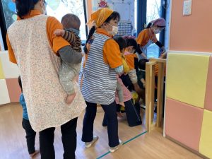 もも組さん?は、保育者に抱っこされて避難しました![]()