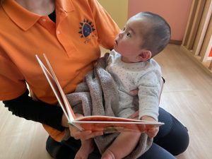 保育者のお膝に座って絵本を読んでもらうことで