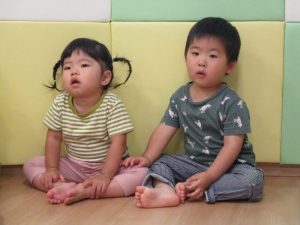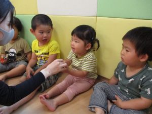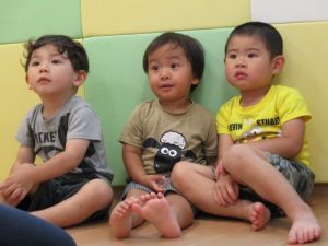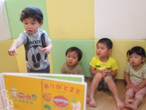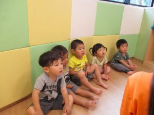 絵本が始まると真剣な表情で見る子どもたち![]()