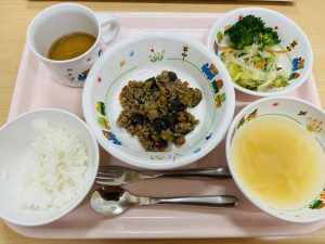 ご飯 味噌汁 麻婆なす 春雨サラダ ブロッコリーの塩ゆで