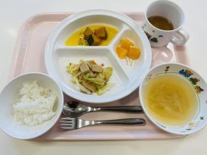 ご飯 味噌汁 高野豆腐とキャベツの味噌炒め かぼちゃの甘煮 オレンジ