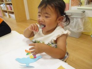 クーピーでシロップを描いてから果物シールをペタペタ![]()