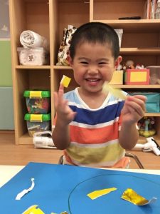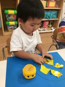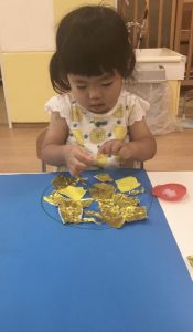 破った折り紙にノリを丁寧にぬって