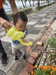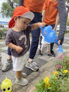花壇の花や野菜の苗にお水をあげたり