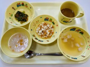 さつまいも粥 味噌汁 豆腐の煮物 青菜の煮浸し