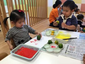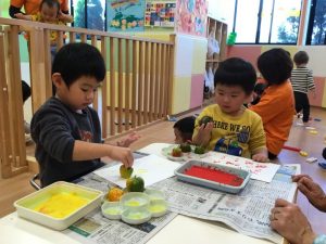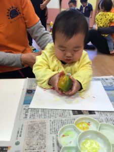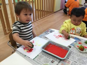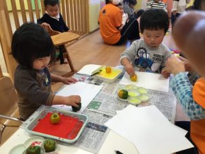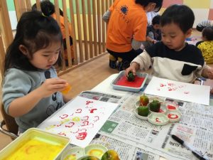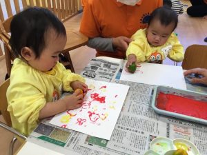 赤や黄色の絵の具をつけてペッタン![]()
