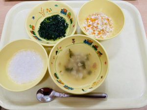 粥 味噌汁 豆腐と野菜のだし煮 ほうれん草のごま和え