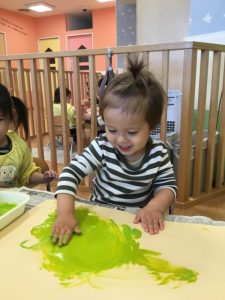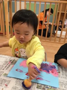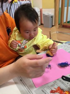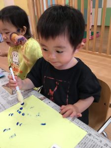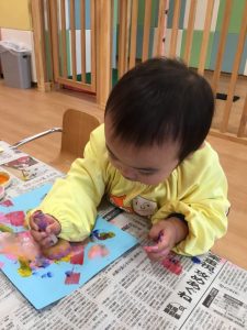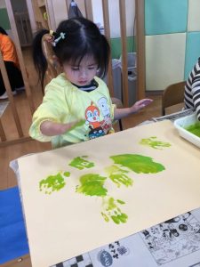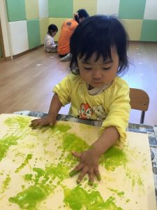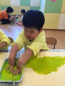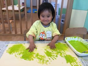 2歳児クラスのお友だちは、手に絵の具を塗ってダイナミックに![]()