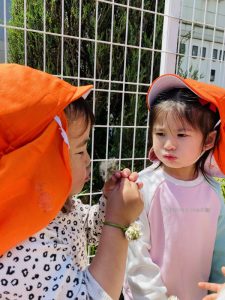 保育者と一緒にお花を詰むと