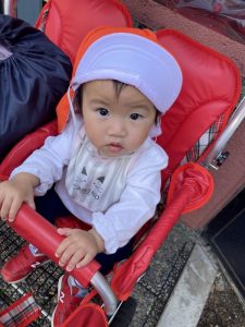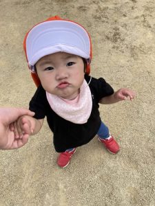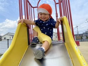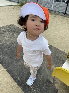 バギーから降りて、保育者と手を繋ぎ公園を探索