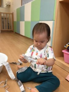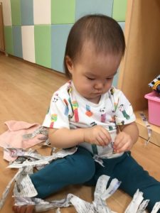 真剣な表情で新聞紙をビリビリ破くお友だち![]()