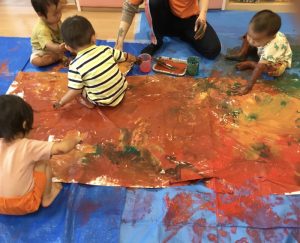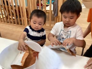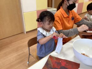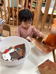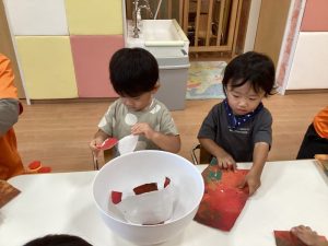 まずは、先週いちご組が描いた絵をみんな小さくビリビリ🖼![]()