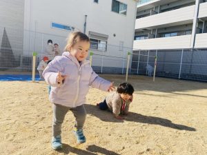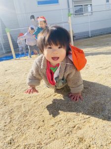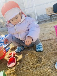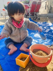 0歳児クラスのお友だちは、お砂場遊びを楽しんだり