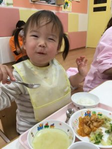 いちご組のお友だちも上手にスプーンやフォークを使えるようになってきました🍴