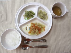 (写真は普通食になります。年齢によって盛り付け量を変えて、提供しています。)