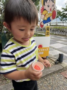 紙コップにカラフルな氷を入れていきジュース屋さんがスタート🍹
