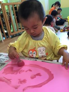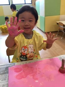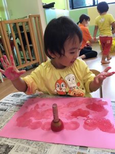 勢いよくスタンプしたので手にも絵の具が🖐️!